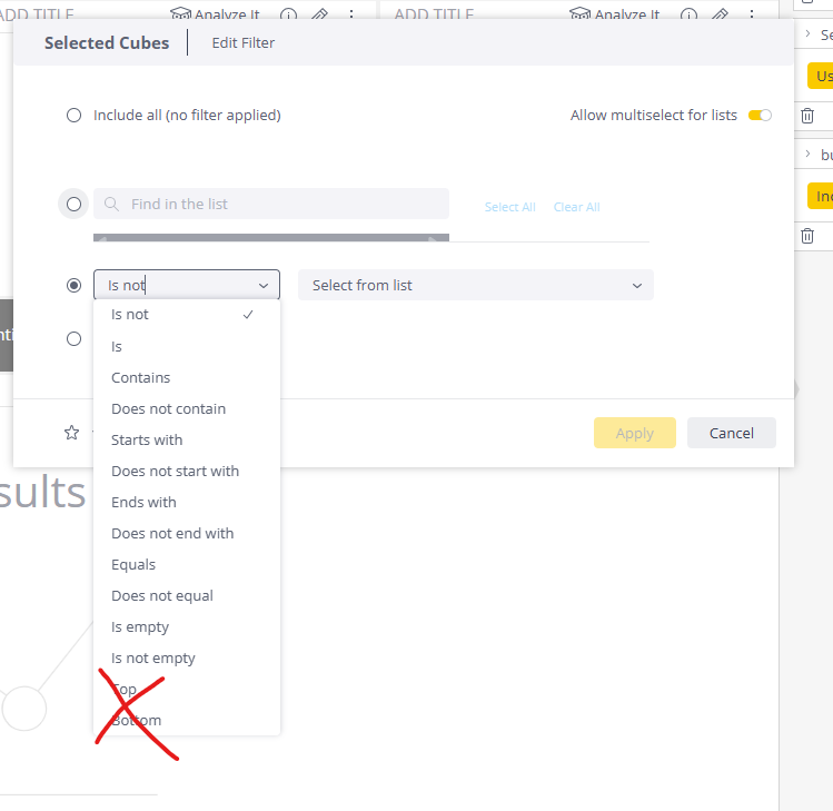 Remove irrelevant options from Sisense’s native filter dialog across text, number, or date dimensions. - Rule-Based Configuration Controls: